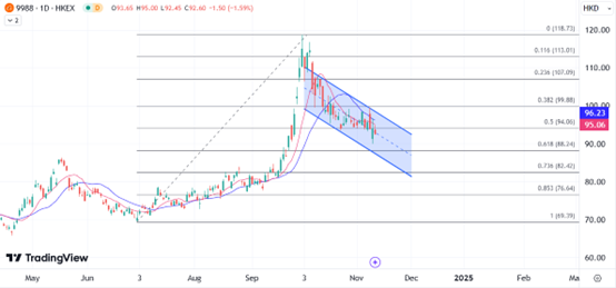 9月淘宝打通微信支付,有助于提高活跃买家数量,从而有助实现更为稳定的GMV动态。随着最新政策提振消费信心,阿里一系列提升用户体验及保障商户的举措将逐步发挥效用,有望进一步转化为业绩的提升。另外关注云计算收入或逐季加速,同比增长有望达到7.8%。与此同时股份回购及纳入互联互通将为股价带来支持。阿里巴巴股价需要再继续守住90港元关口的情况下重新寻求反弹趋势,如果借财报上扬,首先面对的是95至102港元区间的阻力。