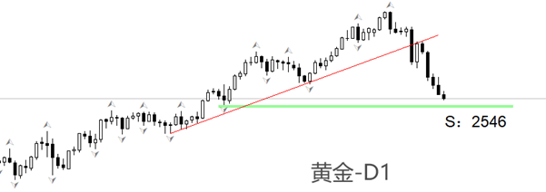 10月31日触及历史最高点之后,黄金进入新一轮下跌走势中。截至目前跌势流畅,没有出现明显反弹。市价距离下方支撑位S:2546美元较近,可能会在次数出现反复。由于没有反弹波段做参考,当前的跌势虽然凌厉,但仍不能确定是否为趋势性反转。