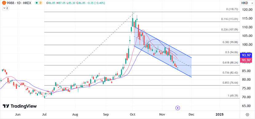 淘天收入重回增长带动利润大增,不过由于对用户体验的投入增加,因此削弱了盈利能力,且营收不及预期,让整体业绩喜忧参半。上周五业绩公布后,阿里巴巴美股盘前股价先行走高后回落,阿里巴巴港股股价已经连跌六周,今早在绩后轻微低开,股价下试了下行通道底部,如果获得支撑可以守在80港元上方,否则可能指向更低的77港元低位。