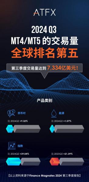 根据Finance Magnates最新发布的2024年 Q3行业报告显示,ATFX凭借高达7334亿美元的季度交易量,稳居全球前五,这一数据不仅验证了ATFX的强劲市场地位,也证明了其持续创新和稳健发展策略的成功。尤其值得注意的是,ATFX在多个交易品种上均展现出亮眼的业绩,包括货币对、指数等领域的显著增长,这得益于品牌全球布局和团队对市场动态的精准把握。