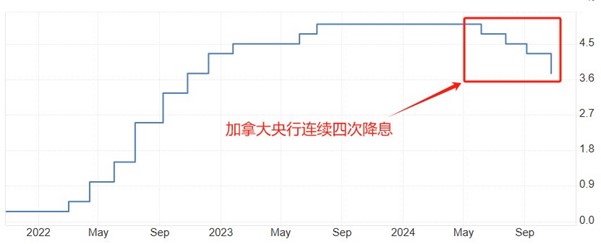 本周三22:45,加拿大央行将公布利率决议结果,主流预期认为其将降息50基点,基准利率从3.75%骤降至3.25%。今年以来,加拿大央行已经进行了四次降息,前三次降息幅度为25基点,第四次开始降息幅度扩大至50基点,预计本次决议将会维持这一降息幅度。加拿大央行之所给予降息,一方面是因为通胀率数据降幅超预期,另一方面是因为美国的贸易措施可能导致加拿大出口产业受损,主动降息有助于加元贬值并提振出口产业。