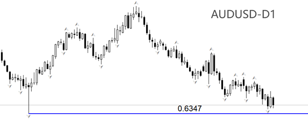 日线级别看,AUDUSD的基准波段为8月5日至9月30日的上涨幅度,持续时间约两个月,区间下限0.6347,上限0.6941,差值594基点。10月份至今,AUDUSD持续下跌,累计跌幅即将回吐所有基准波段涨幅。图中蓝色线为基准波段下限0.6347,最新市价0.6393,两者差距约50基点,短期有可能会出现交叉。