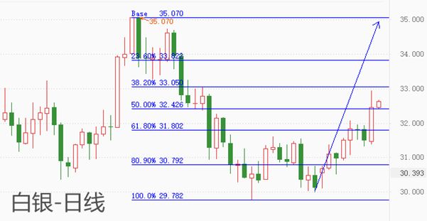 日线级别看,白银的走势与黄金类似,只不过波动幅度大于黄金。基准波段为10月23日至11月14日,区间为(35~29美元)。11月27日附近的五根K线形成底分型结构,意味着未来行情可能从分形低点29.9美元向基准波段最高点35美元的移动。最新市价32美元,已经向上限移动了一段距离,但尚未达到0.382的黄金分割关键价位,预示着上涨空间仍存。