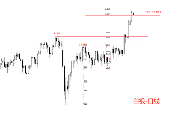 走势结构角度看,日线级别,白银处于中期上涨趋势中,最新波段为上涨波段。需要注意的时,4月7日,白银由大跌转为大涨,在K线图中形成显著的V型反转结构。V型反转往往意味着市场情绪面较为极端,虽然最新波段为上涨,但需要警惕市场情绪的迅速反转。最新上涨波段相比前一个下跌波段,涨幅已经达到2.382~2.618的扩展黄金分割区间。如果今日K线收出中阴线,意味着2.382分位36.5美元的价格具有压制作用,未来可能出现回调。如果今日依旧以阳线收盘,则涨势延续概率较高。