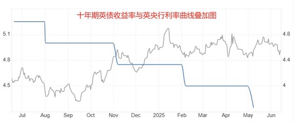 本周四19:00,英国央行将公布6月利率决议结果,主流预期认为其将按兵不动,维持4.25%的基准利率不变。2024年7月份以来,英国央行降息四次,累计幅度100基点。最近一次降息出现在5月份,不存在如美联储一般的暂停降息问题。之所以金融机构预测英央行本次按兵不动,是因为英央行内部认为之前的降息节奏过快。正如英国央行首席经济学家皮尔所说:“去年夏天以来的降息过快,限制性利率的退出需要减缓速度”。今年以来,十年期英国国债收益率保持横盘震荡态势,没有像因果基准利率那样快速下行,这也是英央行将在较长时间内维持基准利率不变的信号。