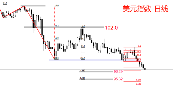 走势结构角度看,日线级别,美元指数处于中长期空头趋势之中,最新波段为下跌,且跌势猛烈。最新市价运行于小级别反弹波段的1.382~1.618分位之间,可能获得小级别的支撑。今日K线形态较为关键,如果收阳线或者下行线较长,意味着支撑有效。再往下是大级别支撑区间(96.29~95.32),这是前一轮大级别反弹的1.382~1.618分位处,市价在此处止跌反弹概率较高。