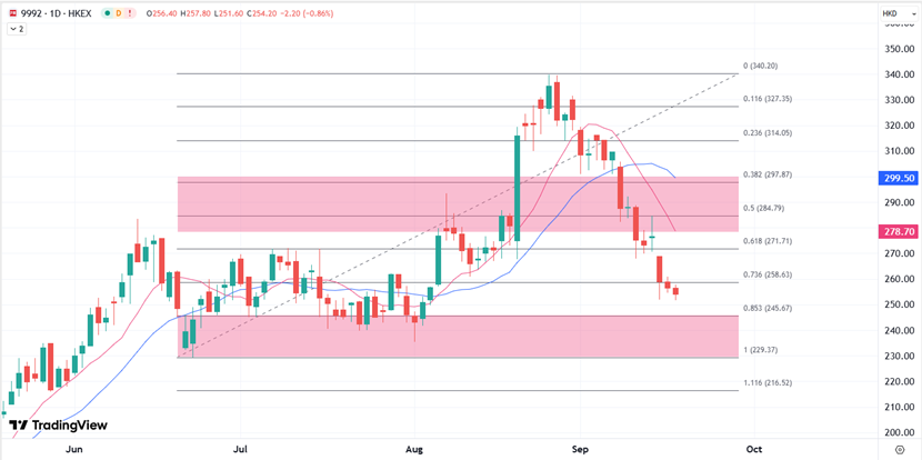 自8月26日创出339.8港元/股的历史高点后,泡泡玛特股价持续阴跌,截至今日收盘较最高点已经跌去23.78%,市值蒸发超千亿港元,而同期恒指上涨了2.16%。综合来看,泡泡玛特目前处于短期高估值调整与长期成长逻辑并存的局面,短期确实需要消化前期过大涨幅,因此需要等待更多催化剂反弹。应注意股价波动可能较大,当前股价经过连续调整后,分别聚焦技术上6月底和8月初的低位是否能再次提供关键的支撑,捍卫220港元后重新寻机反弹;阻力方面分别落在日图均线的280至300港元关口范围内。