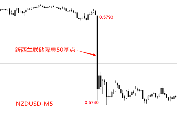 降息50基点的消息公布后,NZDSUD剧烈下跌。5分钟内,市价从最高0.5793跌至最低0.5740,跌幅53基点。新西兰元的对手货币是美元。美联储在9月份重启降息,降幅25基点。新西兰想要保持本币贬值的态势(促进出口),就需要比美联储更大的降息幅度。据此判断,新西兰联储的政策意图可能是引导新西兰元持续走弱。
