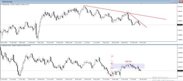 周线级别的走势要比日线更加流畅。图中紫色区域为前一轮下跌波段的0.382~0.618分位处,NZDUSD的反弹最高点0.6119正处于该区间附近,意味着反弹充分,空头趋势延续。叠加新西兰联储超预期降息,7月份至今NZDUSD空头走势延续概率较高。