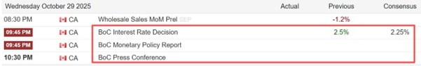 本周三21:45,加拿大央行将公布10月利率决议结果,主流预期认为其将降息25基点。加拿大经济发展严重依赖美国。今年以来,美国总统特朗普不断提高自加拿大进口商品的关税,叠加美国本身宏观经济有衰退迹象,加拿大经济的增长前景异常悲观。上周六,特朗普在社交媒体表示,将会对加拿大额外征收10%的关税,以报复其刊登批评美国关税政策的广告的行为。这将严重削弱市场人士持有加拿大元的信心。