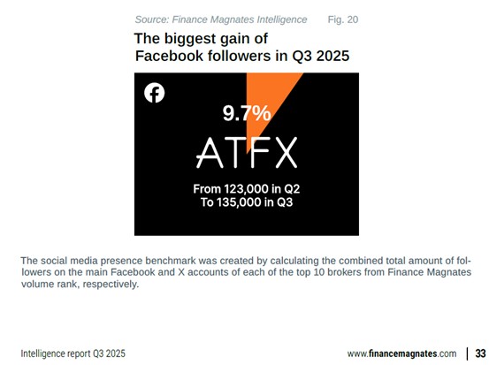现在,让我们把目光聚焦到2025年第三季度的线上交互平台上。在Facebook平台粉丝增长这一关键指标上,ATFX的表现格外突出,堪称一匹黑马。与第二季度相比,我们的粉丝数量实现了9.7%的显著增长。具体数字方面,第二季度时,ATFX在Facebook上的粉丝数量为123,000人,而到了第三季度,这一数字成功跃升至135,000人,增长态势十分强劲。