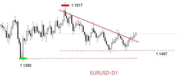 技术角度看,日线级别,EURUSD处于高位横盘震荡状态,震荡上限在1.1917点,下限在1.1390点。11月26日的阳K线,与图中的下降趋势线交叉,反弹走势有加速迹象。截至目前,已经有连续五根K线的收盘价处于下降趋势线上方,形成有效突破结构。考虑到EURUSD在前一轮走势中保持震荡区间内顶部到底部的运行,本次反弹走势可能遵循底部到顶部的震荡区间运行,中期目标或在前期高点1.1917附近。