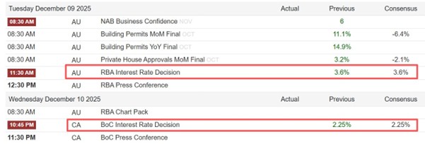 本周二11:30,澳洲联储将公布12月利率决议结果,主流预期澳洲联储将维持3.6%的现金利率不变。本周三22:45,加拿大央行将公布12月利率决议结果,主流预期其将按兵不动,维持2.25%的隔夜贷款利率不变。之所以将澳洲联储和加拿大央行的利率决议合并说明,其一是因为两者预期都将维持利率不变;其二是两个国家的货币都是商品货币,受货币政策的影响较弱。澳大利亚铁矿丰富,所以澳元是以铁矿石为锚定物的商品货币;加拿大石油丰富,所以加元是以石油为锚定物的商品货币。澳大利亚的铁矿石主要销往亚洲,加拿大的石油主要出口到美国。现阶段,因为亚洲主要经济体增长乏力,美国又与加拿大存在贸易摩擦,所以澳元和加元都存在贬值压力。不过,因为澳洲联储和加拿大央行都选择不再降息,美联储利率却一降再降,所以中短期澳元和加元仍有升值可能。
