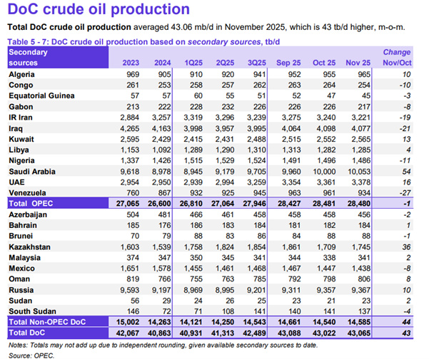 欧佩克发布原油市场月报,其中提到:11月份,OPEC原油供应量为2848万桶/日,相比10月份减少了1万桶/日;OPEC+的原油供应总量为4306.5万桶/日,相比10月份增加了43万桶/日。非OPEC+国家的原油产量,预计在2025年增加100万桶/天,主要增长动力来自于美国、加拿大、巴西和阿根廷。