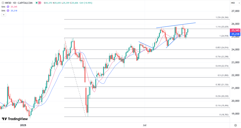ATFX港股:芯片股领涨带动人气,恒指止步连跌维持高位整理 ATFX:港股连跌3日后今早回稳高开后进一步反弹,半日升154点或0.6%,报25,212点;国指升52点或0.6%,报8,989点;恒生科技指数升45点或0.8%,报5,624点。午后恒指升幅扩大,升逾200点。 科技指数午后升幅扩大至2%,阿里巴巴(09988.HK)股价升1.9%,腾讯(00700.HK