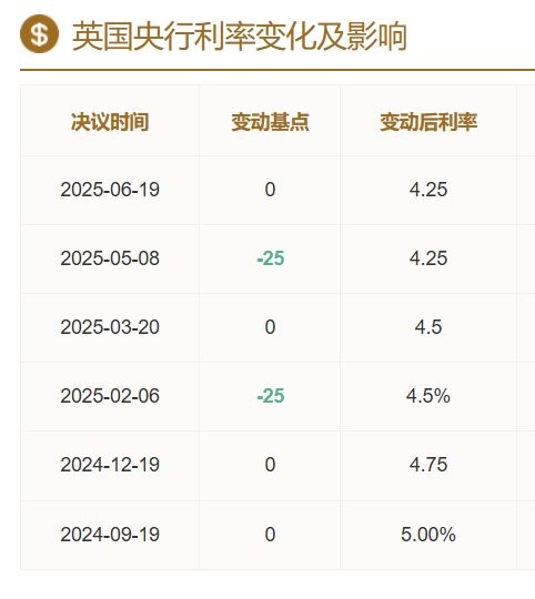 ATFX前瞻:本周即将发布的经济数据重要性由高到低分别为:英国央行利率决议、加拿大就业人数、IA原油库存,接下来做逐一解读。 ▲ATFX图 本周四19:00,英国央行将公布8月利率决议结果,主流预期认为其将降息25基点,基准利率从4.25%下降至4%。今年以来,英国央行的货币政策遵循“间隔降息”的规律,也就是上次决议降
