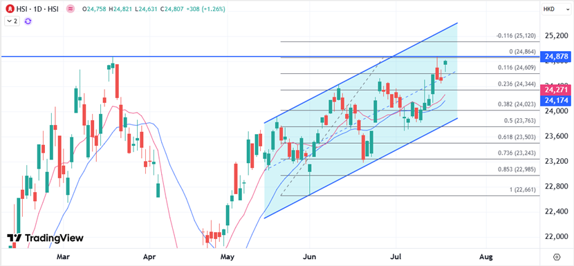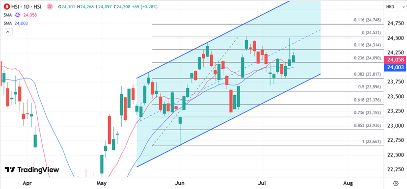ATFX港股:周线锁定两连涨后,前期高位阻力有待突破 ATFX港股:在科技股早段的强势下,港股今日早市曾升逾300点,其后升幅收窄,临近中午收市升幅收窄,半日收报24676,升177点。午后初段续升逾百点,在24600点水平争持。国指升69点或0.8%,报8,922点;恒生科技指数升41点或0.8%,报5,490点。 科技股多数走高,京东(096
