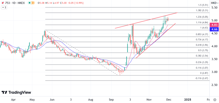 ATFX港股:多项利好集中,航空股顺延强势 ATFX港股:本周港股震荡的同时,航空股整体呈现较积极的表现,延续上周后半段的利好走势。消息面上,本周主要受益于近期公布的假期延长利好,以及中国扩大对外免签的政策。 国务院办公厅发布2025年部分节假日安排的通知:自2025年1月1日起,全体公民放假的假日增加2天,其中春