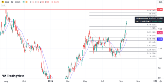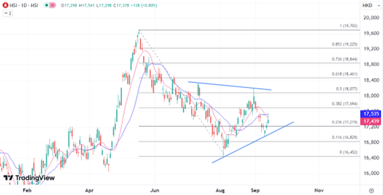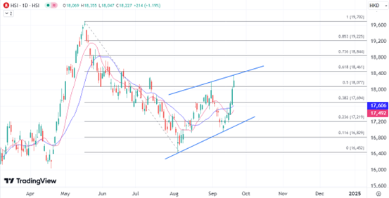 ATFX港股:美联储降息前动能增强,恒指连涨三日累积人气 ATFX港股:港股昨日升过百点后,今早延续升势,盘中升幅一度扩大至300点,半日升167点或1%,报17,408点;国指升62点或1%,报6,080点;恒生科技指数升25点或0.7%,报3,501点。 科技指数午后升幅温和,近录得0.2%的涨幅,阿里巴巴(09988)高开高走创近四个月高位但