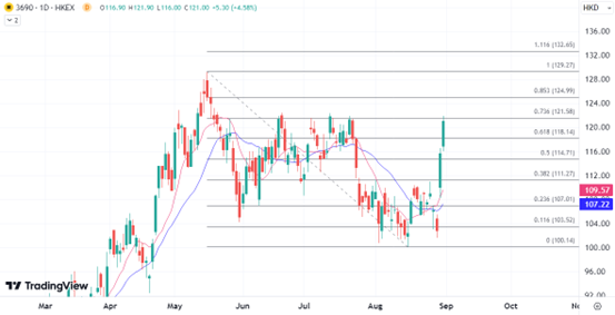 ATFX港股:业绩带来惊喜兼回购,美团股价连升两日 ATFX港股:周四美团(03690)在公布预计后大涨,第二季盈利远优于预期,并公布10亿美元的新回购计划,刺激全日急升12.5%报115.7元,为升幅最大蓝筹,成交居首达100亿港元。 美团今年第二季收入822.5亿元(人民币,下同),按年上升21%,经调整溢利136亿元,增长78%,均