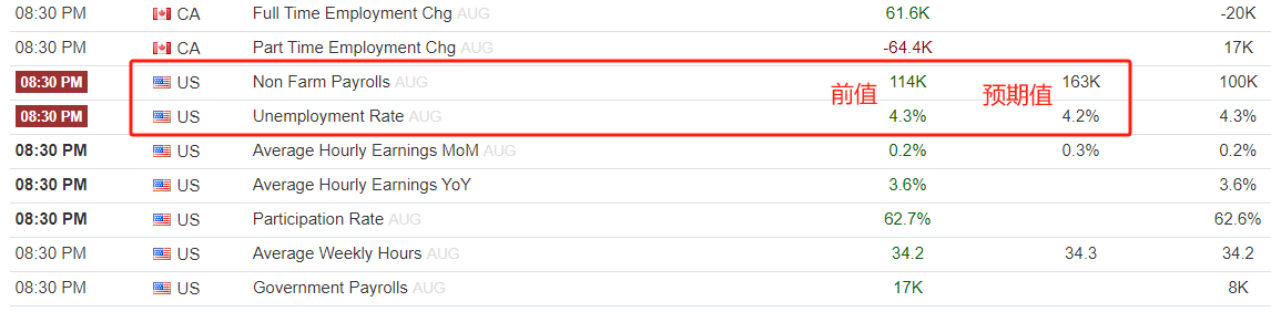 ATFX本周前瞻:本周即将发布的经济数据重要性由高到低分别为:美国8月非农就业报告、加拿大央行9月利率决议、美联储经济状况褐皮书。 ▲ATFX图 本周五20:30,美国劳工部劳动统计局将公布美国8月非农就业报告,其中两项数据最受关注。其一是8月非农就业人口,前值为11.4万人,预期值16.3万人,预期数据将猛增约5万人