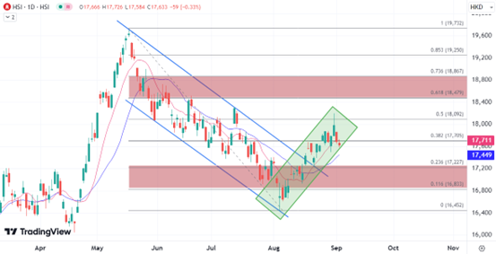 ATFX港股:港股9月开局逊色,技术上伴随调整压力 ATFX港股:港股昨日9月开局急吐近300点后,今早挫逾百点后收复部分失地,内地股市窄幅个别走,上证指数曾再创近7个月低点。恒指半日收报17,627点,跌64点或0.4%,半日高低波幅141点。国指跌20点或0.3%,报6,191点。科技指数报3,496点,升10点或0.3%。 科技指数午后录得