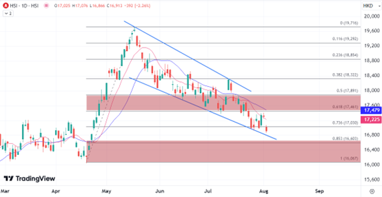 ATFX港股:外围担忧叠加技术压力,恒指再次失守17000点关口 ATFX港股:港股今早低开后一度跌逾300點,一度失守17000点关口。半日急跌354点或2.05%,午后跌穿今早低位,最多跌439点,低见16865,再创4月23日后低位。国指跌116点或1.9%,报5,969点;恒生科技指数跌80点或2.3%,报3,396点。 蓝筹整体挨沽,腾讯(00700)挫2
