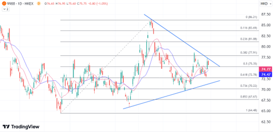 ATFX港股:多重利好集体助攻,阿里巴巴大涨后技术面遇阻 ATFX港股:阿里巴巴(09988)周一股价大涨,盘中曾涨逾5%,为科技股中涨势最强,同时领跑蓝筹贡献大市涨幅,消息面上,阿里云技术被用作转播奥运以及淘天调整商家规则成为主要的上涨催化剂。 今年巴黎奥运会,是历史上首次以云转播的方式,云计算首次超越卫星成为