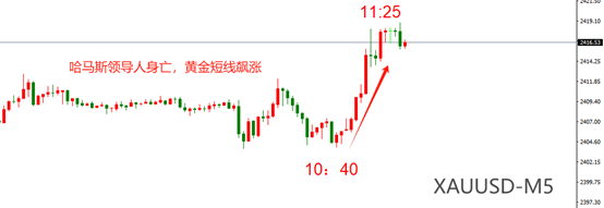 ATFX金属:哈马斯突发重磅消息,黄金短线飙高 ATFX金属:据公开消息,巴勒斯坦哈马斯领导人在伊朗首都德黑兰身亡。受此消息影响,黄金短线飙高,北京时间10:40至11:25,五分钟级别连续收阳线,市价从最低2403美元上涨至最高2418美元,涨幅15美元。白银的反应比较平淡,在黄金剧烈上涨的这段时间,白银价格仅从28.42上涨