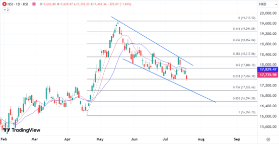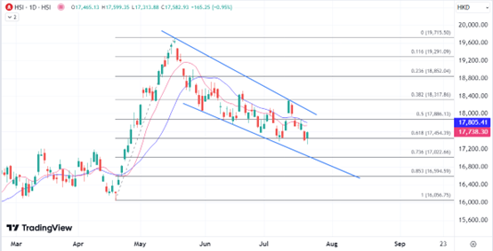 ATFX港股:央行意外下调政策利率,刺激港股从低位止步连跌 ATFX港股:上周恒指全周累计大跌875点或4.8%,创4月26日以来近三个月低位;科指更是大跌6.5%拖累大市。不过中国7月一年期及五年期LR下调10基点,带动今日港股回升,今早一度攀升181点。 恒指半日升142点或0.9%,报17,560点;国指升61点或1%,报6,226点;恒生科