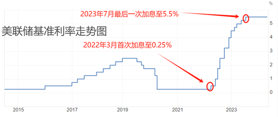 ATFX金属:2022年3月至2023年7月美联储加息周期,黄金白银走势分析 △ATFX图 2022年3月,疫情冲击消退,美联储急于恢复常态化货币政策,启动两年来的首次加息,将基准利率从0%推高至0.25%。2023年7月,美国高通胀问题得到显著抑制,继续升高利率的必要性消失,美联储最后一次加息后停止了激进加息政策,最终基准利率落