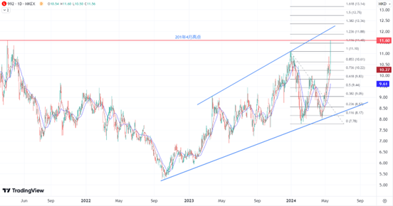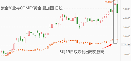 ATFX港股:受金价走强提振,紫金矿业股价创历史新高 ATFX港股:5月19日,纽约黄金价格冲高至2454.2美元,创出历史新高,主营铜、金、锌、锂等金属矿产资源勘查、开发的紫金矿业股价受显著提振。COX黄金和紫金矿业日线股价叠加处理后,两者的价格走势呈现出高度相关性,上涨阶段和下跌阶段基本匹配。5月19日开盘后的5分钟