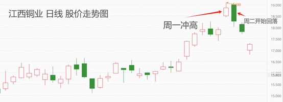 ATFX:铜价冲高后回落,江西铜业止步20港元关口 ATFX:本周一,COX铜价格冲高至5.19美分,创出十多年来新高。周二,铜价维持高位震荡态势。周三,COX铜大跌5.99%,单根K线吞没此前六根K线的涨幅吗。截至今日上午盘,铜价温和波动,下午盘有继续下跌的可能。受铜价剧烈波动影响,以铜、金、银、铅等矿产开发为主营业务的