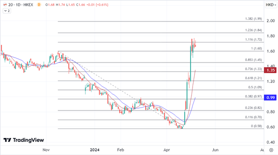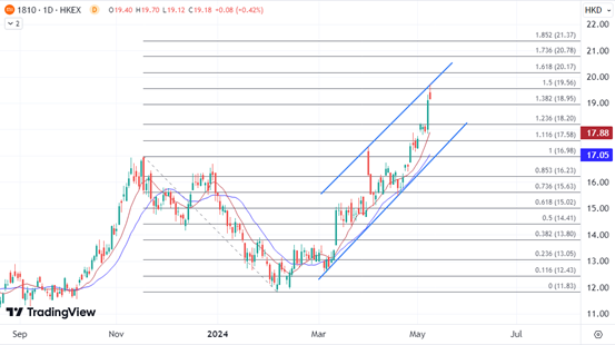 ATFX港股:两大消息助跑股价,小米创两年半高位 ATFX港股:昨日港股延续止步十连涨后的调整,科技指数跑输大市,不过小米(01810.HK)股价逆市走高6.5%,全日最多升7.7%,为两年半高位。消息面获得两大消息的刺激,一是据报U7AX提前交付期,二是据悉小米第3季将推两款新机。 小米汽车预订客户在社交媒体透露,U7AX版本交