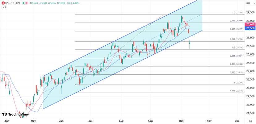 ATFX港股:关税威胁引发港股大跌,恒指五日连跌后继续寻底 ATFX港股:特朗普突然宣布新关税,原本已连跌5日的港股进一步寻底,今早进一步跌穿两万六关口,一度下跌多达954点,低见25336点,半日收报25374,挫916点或3.49%;国指跌325点或3.48%,报9032点;科指跌284点或4.54%,报5975点。大市午后初段跌幅略收窄至近800