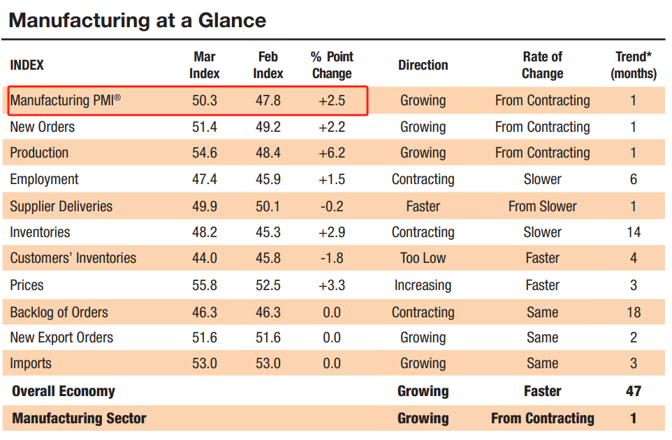 ATFX汇市:美国3月I制造业I为50.3,远高于前值47.8,经济景气度高 ATFX汇市:虽然国际市场的主流预期是美联储将于今年六月份开启首次降息,但降息的前提条件——美国经济显著衰退——似乎远未到来。此前公布的美国非农就业报告显示,新增非农就业人口27.5万人,处于近12个月的数据峰值水平;失业率3.9%,低于自然失业率
