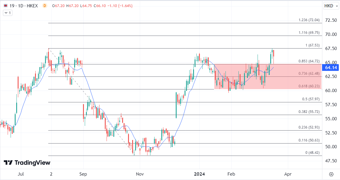 ATFX港股:友邦绩前股价四连涨,紧盯区间顶部阻力位 ATFX港股:友邦(01299)将于周四(14日)公布2023全年业绩,市场聚焦在友邦内地的产品组合销售和利润率前景、访港内地客业务可持续性。综合预估友邦2023年纯利介乎52.58亿美元至72.88亿元,较2022年同期的2.82亿元,按年升17.6倍至24.8倍,中位数59.24亿元按年升20倍