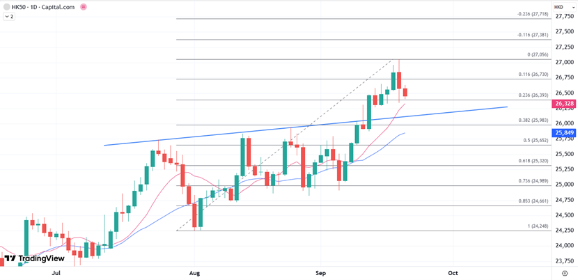 ATFX港股:恒指延续上周的调整,但不阻碍中长线继续刷高 ATFX港股:此前三周累涨6%后,今日港股早市偏软,恒今日恒指低开85点,报26459点后反覆向下,一度最多跌304点,半日跌264点或1%,报26,280点;国指跌122点或1.3%,报9,349点;恒生科技指数跌74点或1.2%,报6,220点。 科技股除了芯片概念股外多数走低,百度涨3.5%
