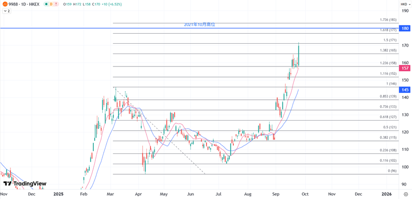 ATFX港股:今日港股主要科技股中,阿里巴巴走势最为强劲,早段盘中升7%,创2021年10月以来新高。阿里巴巴(09988)年度活动云栖大会周三开幕,阿里巴巴集团行政总裁吴泳铭重申正积极推动3,800亿元人民币的人工智能(AI)基建资本开支,并计划追加更大投入。 预期AGI走向AI将分为四阶段:智能涌现(学习人)、自主行动(辅助人)
