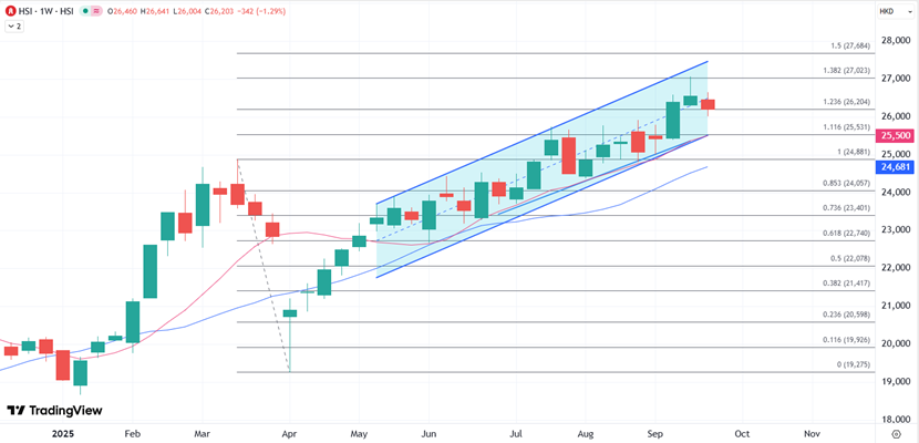 ATFX港股:恒指延续调整,周线锁定三周来首次下跌 ATFX港股:今日在科技股拖累下,恒指一度跌近300点后跌幅收窄,半日跌171点,报26,312点;国指跌57点或0.7%,报9,386点;恒生科技指数跌66点或1%,报6,312点。午后港股跌幅有所收窄至不足100点。 科网股普遍受压,小米(01810)在17系列旗舰机型发布会后回吐,机构认为其