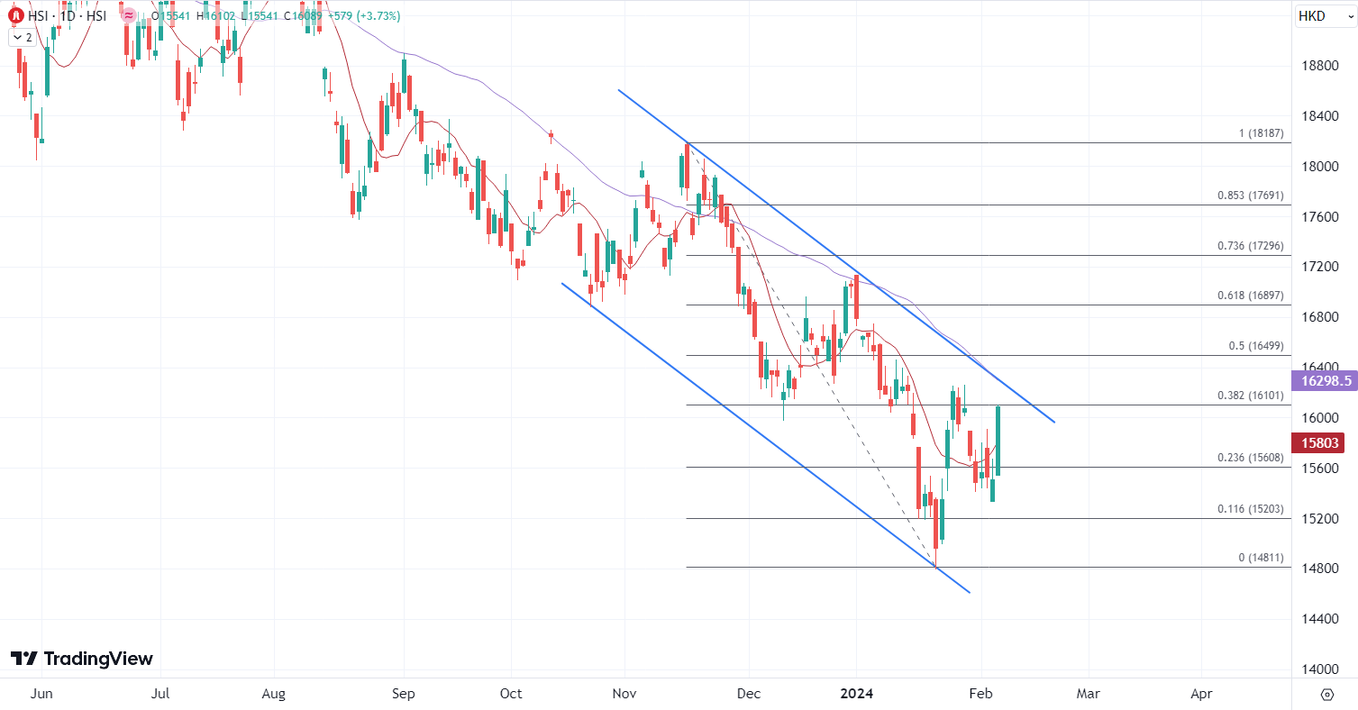 ATFX港股:中央政策再度出招,恒指重夺万六关口 ATFX港股:据报中国多方面限制国内及境外机构投资者交易遏止股市大跌,加上更多政策面出招,港股今早高开,在科网股支撑下造好,恒指升幅扩大至逾200点,午后涨幅扩大至逾500点冲上16000点关口。 恒指半日升380点或2.5%,报15,890点;国指升161点或3.1%,报5,378点;恒生