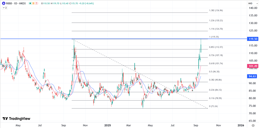 ATFX港股:从苹果合作到自研芯片训练AI模型,本周百度利好频传 ATFX港股:本周由于百度(09888)传出与苹果公司合作,百度股价在周一大涨逾9%,创去年10月以来的高位后,今早继续受到利好牵动而跳空高开,盘中涨近一成。最新消息称,阿里巴巴(09988)和百度传出已开始使用内部设计的芯片来训练其人工智能模型,部分取代英伟