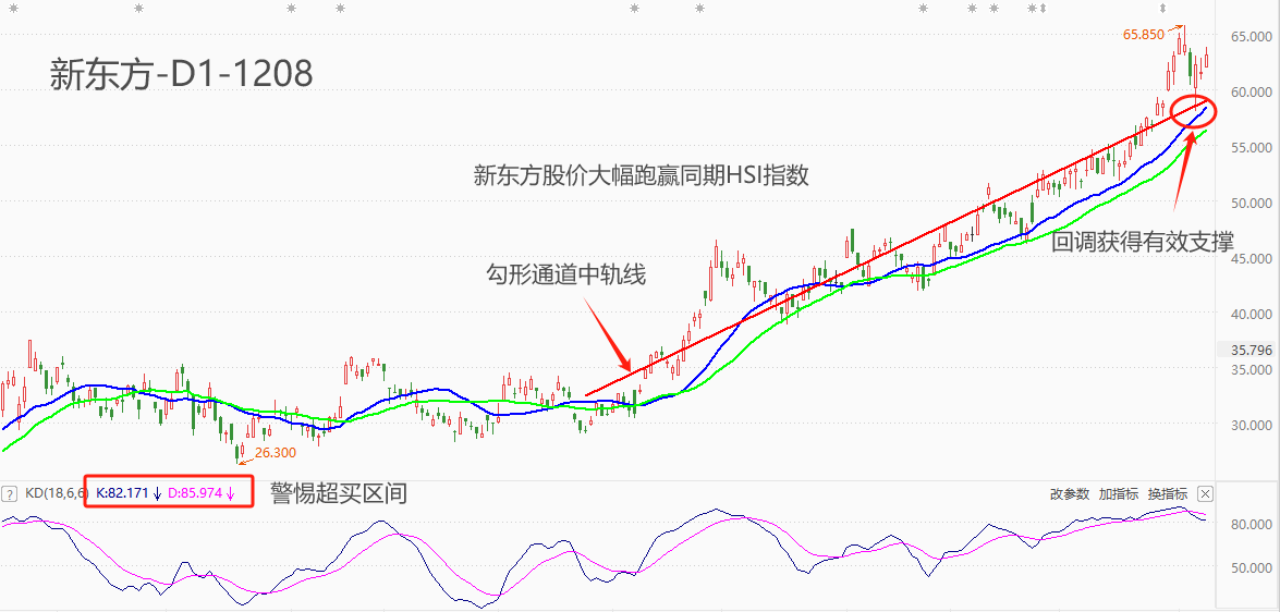 ATFX港股:新东方股价经历短暂回调后,有望再创年内新高 ATFX港股:在恒生指数表现疲软之际,新东方股价一枝独秀:今年以来,新东方-股价累计涨幅121.4%,翻一倍有余,而同期的恒生指数大跌17.69%。新东方能够实现持续性的股价走强,得益于其在教培行业面临危机时,果断且准确的选择了直播带货的转型业务。新东方旗下直