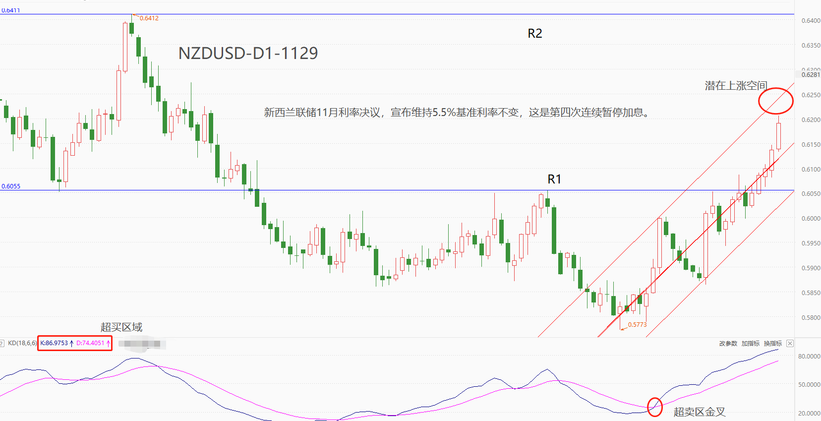 ATFX汇市:新西兰联储维持利率不变,第四次暂停加息,NZDUD短线走高 ATFX汇市:今日9:00,新西兰联储公布11月利率决议结果(也是年内最后一次),宣布维持5.5%的基准利率不变,这已经是连续第四次决议宣布暂停加息。新西兰联储会议纪要中提到:“成员们讨论了提高OCR的可能性。委员们一致认为,在利率已经受到限制的情况