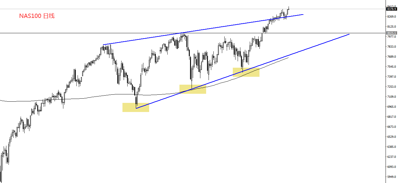以昨日涨幅最高的纳斯达克指数为例,我们能看出美股自今年持续上涨。虽然4月份至5月份回调了一段周期后,但接下来仍以楔形整理的趋势向上攀升,每次回调都未跌破前期的关键中枢点(黄色矩形位置)。