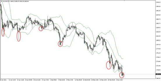 因此本周非农数据仍然落下悬念。若好于预期大幅增加就业岗位,美元或许将继续反弹上行,美股也有一定的向上调整的概率存在。相反,若非农数据不及预期,黄金或将迎来调整反弹走势。尤其目前黄金4小时周期上价格再次超出布林带外轨一带,根据过往统计来看,异常波动后黄金均有一定回调的压力存在。