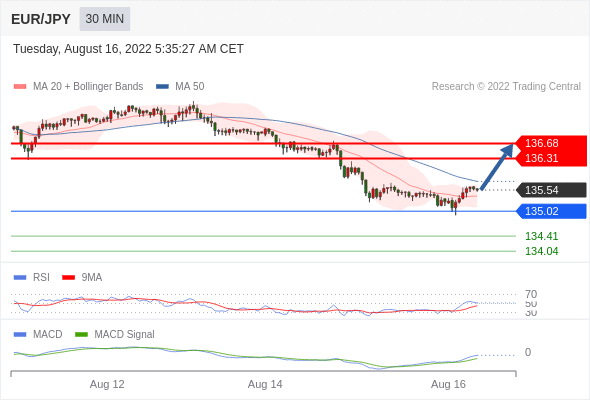 如跌破 135.02 ,EUR/JPY 目标方向定在 134.41 和 134.04 。