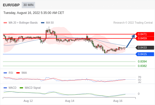 RSI技术指标超过50。 MACD技术指标呈现看跌状态并 处在其信号线的上方。 另外,价位在其50天移动平均线以下 ( 0.8438 ) 但高于20天移动平均线 ( 0.8429 )。