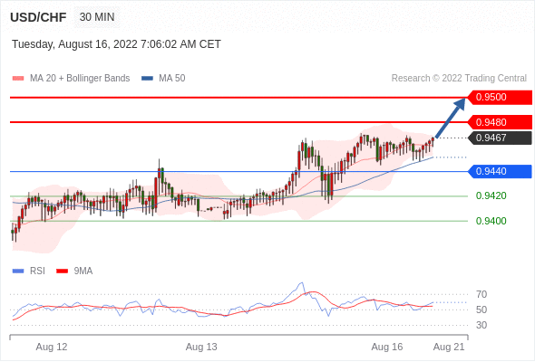 在 0.9440 之上,看涨,目标价位为 0.9480 ,然后为 0.9500 。