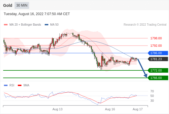 在 1786.00 之下,看跌,目标价位为 1772.00 ,然后为 1766.00 。